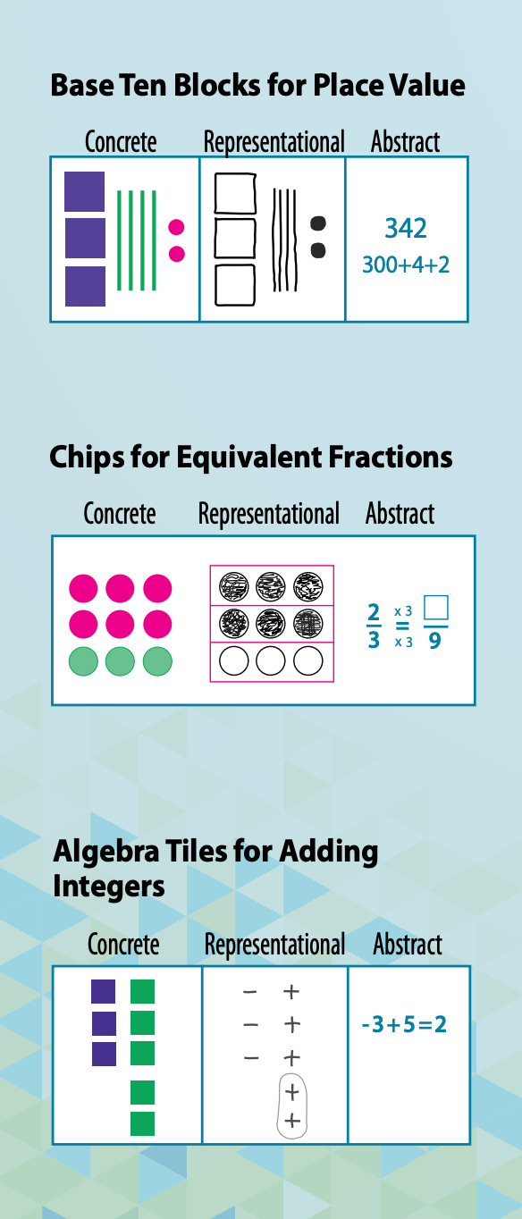 Concrete: I start by using physical objects to model math concepts, which research shows improves comprehension for younger students and visual learners.